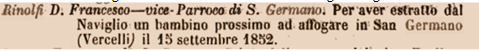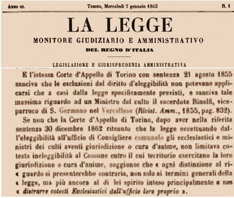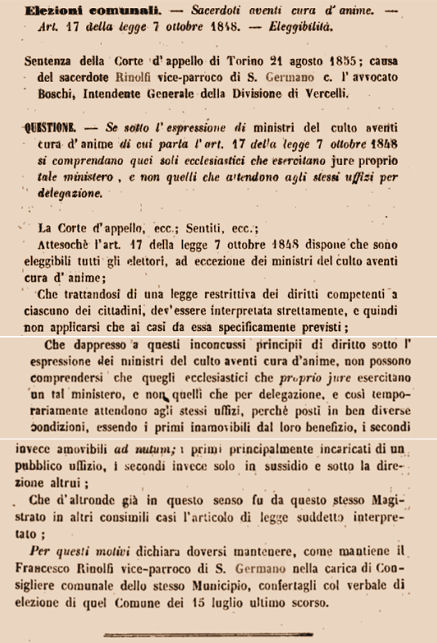 Il Parroco Consigliere Comunale Riportiamo il curioso caso di Don Francesco Rinolfi parroco a San Germano , che nel 1855 viene eletto viene eletto come Consigliere comunale. Scatenando una controversia giuridico-amministratva. Don Rinolfi era già assunto alle cronache per una medaglia d'argento al Valor Civile conferita con Decreto del 13 gennaio 1853