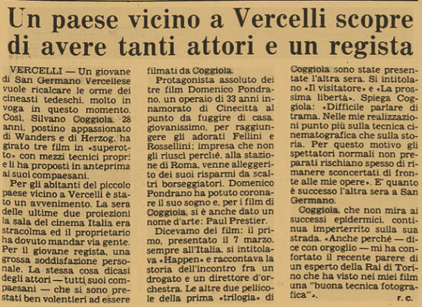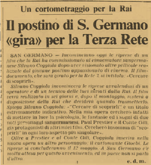 | I due articoli di giornale datati rispettivamente Dicembre1980 e Maggio1981 , testimoniano un biennio di frenetica attivitā culturale nel nostro Borgo . Il Regista sangermanese Silvano Coggiola č riusito a coinvolgere nei suoi bei lavori un gruppo di ispirati attori di San Germano. | |