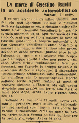 Nel pomeriggio del 6 aprile 1926 Celestino Usuelli tornava a Milano in auto ; veniva da Torino ov'era stato a celebrare la Pasqua in casa di una sua cugina . Lo accompagnava l'autista .Oltrepassato di un centinaio di metri il centro abitato di San Germano Vercellese , (procedeva a forte andatura) si trovò fra due grossi autocarri . Dapprima Usuelli accelerò sperando di riuscire a passare in mezzo , ma subito dopo si avvide che la manovra non sarebbe riuscita . Allora frenò di colpo , e fu questo a perderlo. Al brusco arresto infatti la macchina sbandava , si rovesciava sopra un mucchio di ghiaia e cozzava contro un paracarro che fu divelto. Usuelli veniva sbalzato dal posto di guida , piombando in fondo alla scarpata della strada . Non ebbe il tempo di rialzarsi perchè , in un baleno , la vettura gli fu addosso e lo travolse uccidendolo sul colpo. L'autista invece , rimasto disperatamente avvinto allo schienale dell'auto , rimaneva pressochè illeso.