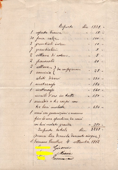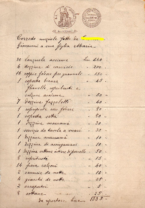 matrimonio della figlia. Questo atto, interessante dal punto di vista sociale, in passato, sostituiva spesso i “Capitoli matrimoniali” legalizzati e aveva valore di documento giuridico per la ripartizione dei beni dotali, in caso di scioglimento di Matrimonio. Per questo ciascuna delle due famiglie ne conservava accuratamente una copia. |