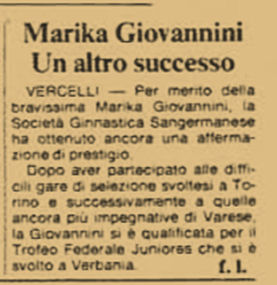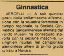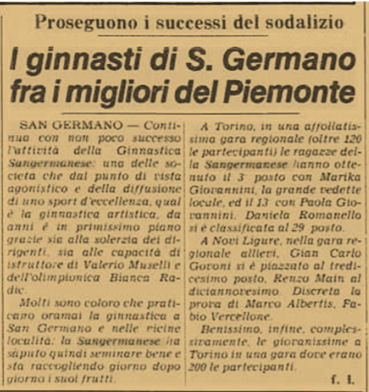 Siamo negl'anni che vanno dal 1977 ai primi anni 80 , lo sport sangermanese raggiunge con la ginnastica un punto d'eccellenza nello sport vercellese. Grazie al paziente lavoro dell'istruttore Valerio Muselli e dell'Olimpionica Bianca Radic che hanno allenato i giovanissimi sangermanesi , aiutandoli a vincere numerosi trofei e riconoscimenti. |
