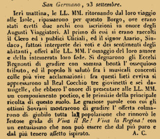 Festeggiamenti per il passaggio del Re Carlo Felice e della Regina Maria Cristina di Borbone a San Germano nel Settembre 1828 |