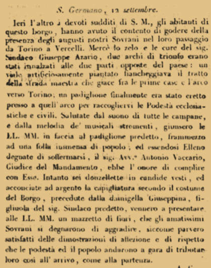 | Nel Settembre 1828 i sovrani dello Stato Sabaudo nel loro viaggio verso le isole passano nelle due occasioni di andata e ritorno dal nostro borgo , ed in entrambe le occasioni la cittadinanza sangermanese si trova pronta ad accoglierli. Riportiamo dalle cronache dell'epoca i due avvenimenti | ||